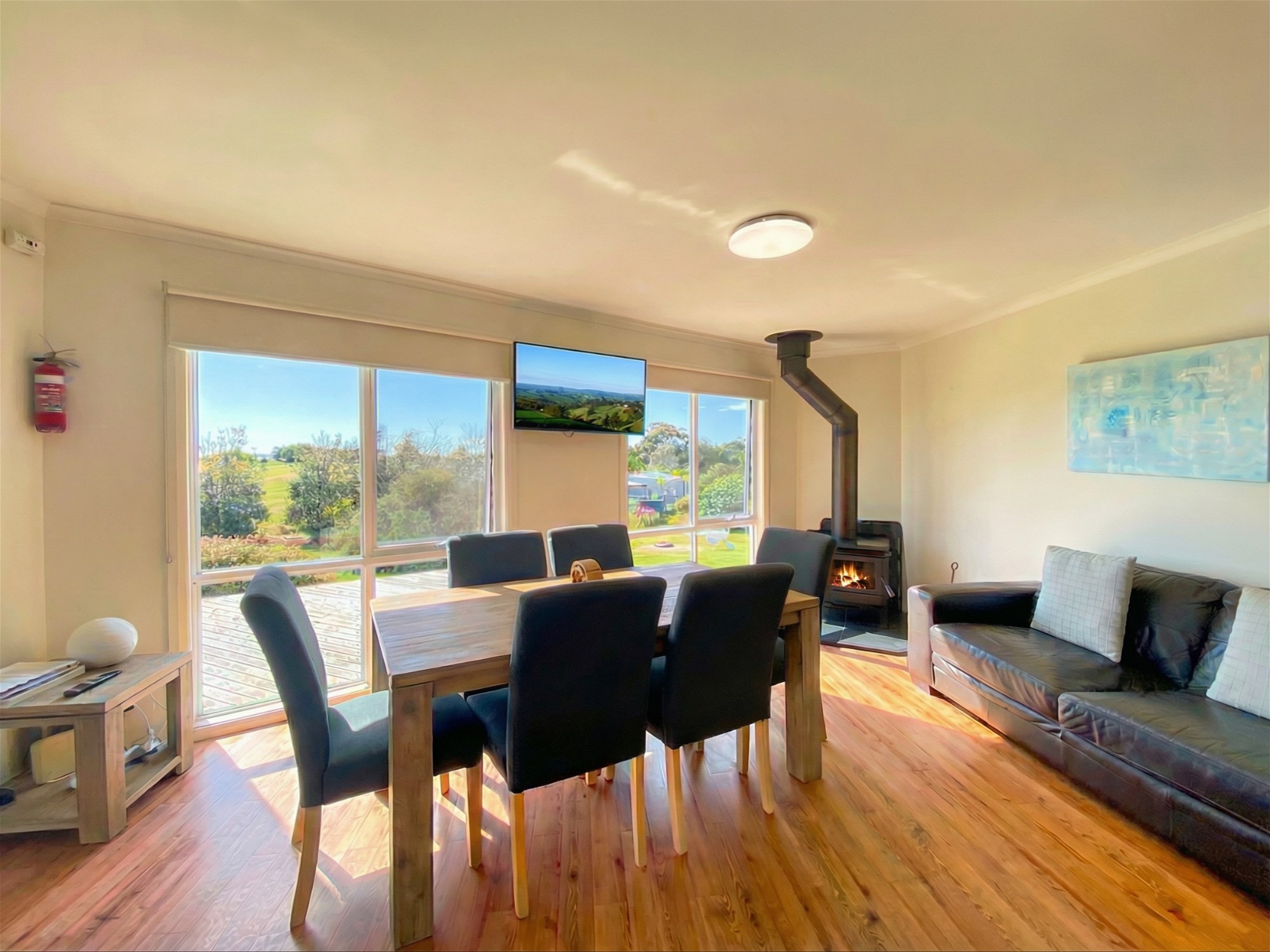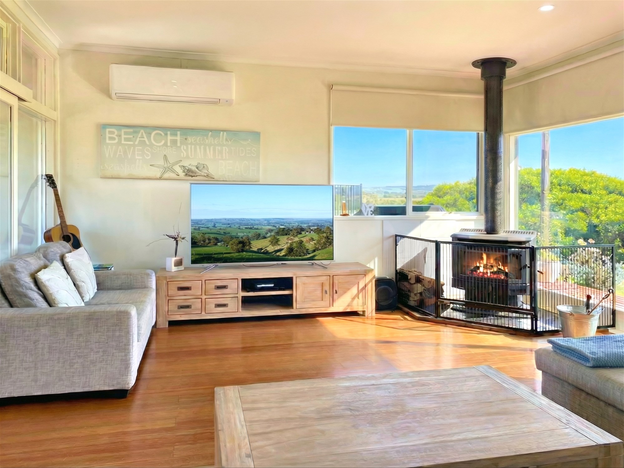 The interior reflects a sophisticated yet earthy aesthetic, perfectly attuned to the environment. Polished timber floors bring warmth and texture to the open-plan living zones, anchored by a wood heater that promises cosy winter evenings watching the mist roll off the inlet. Reverse cycle air conditioning ensures year-round comfort, while the layout has been carefully considered to prioritise privacy and relaxation.